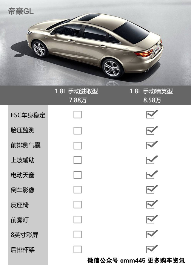 相比次配级精英型,7千元的差价可以获得更多安全、舒适性的配置,也能将帝豪GL的形象上升一个层级。