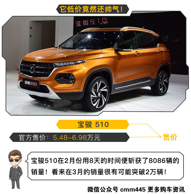 上市约8天销量为8086辆!宝骏510貌似以价格屠夫的姿态正式上市,小虎认为要购买宝骏510的话直接买顶配车型性价比是最高的,因为它比中配多出了前排侧气囊、胎压监测、无钥匙进入与启动、全景天窗、GPS等等配置,但是售价仅多出7000元!而顶配车型的落地价格约为7.9万,用不到8万的价格就能买到10万元配置水平的车型,我想这么高的性价比正是它热销的主要原因!