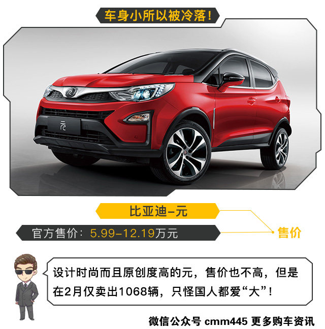 现在是一个SUV车型横行的时代,对于刚出来工作不久带又喜欢SUV的朋友来说,购买售价低廉的国货小型SUV貌似是不二之选,只是现在市面上的小型SUV非常多,其中有的车型几乎卖断货、有的则销量惨淡,就像在2月份哈弗H2卖出了25059辆而比亚迪元的销量仅有1068辆,这其中的差距接近25倍!