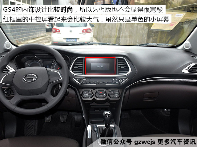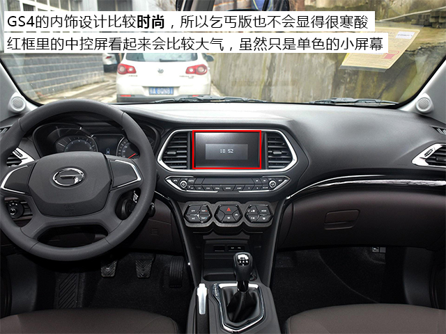 内饰方面,传祺有一点是做得挺周到的,虽然乞丐版车型的中控只有一小块单色屏,但这个单色屏加上周围的黑色边框之后就跟中控大屏的面子相当,不点亮屏幕的时候会有一种搭载了大屏的错觉。