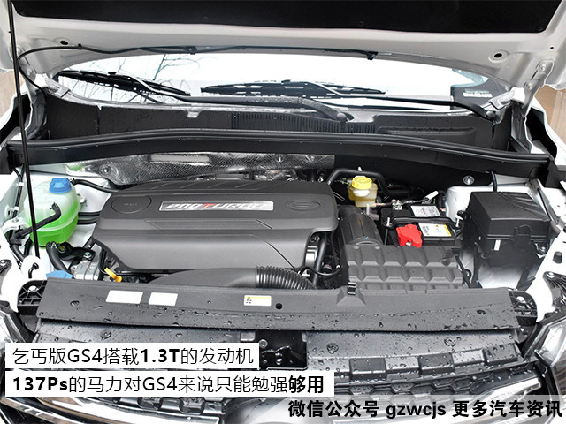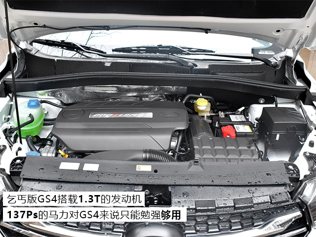动力系统方面,乞丐版的GS4搭载的是1.3T的发动机,最大马力只有137Ps,对于一款尺寸不小的SUV来说,这个动力水平只能勉强够用,但好在它采用的是手动变速箱,动力不够还可以拖转速来凑。