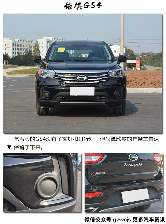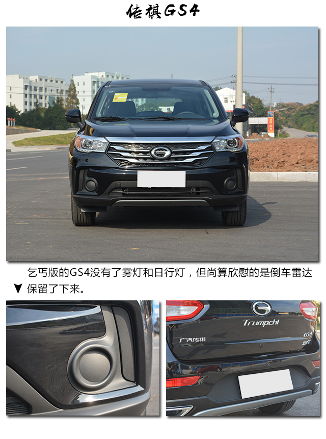 同样是销量很不错的SUV,乞丐版的GS4和高配车型拥有一样的中网造型,以及对于SUV来说很有用银色车头护板,但在雾灯位置则明显的减配的,少了雾灯和LED日行灯。至于车尾则和高配车型一样配备了三颗倒车雷达,实用性很好。