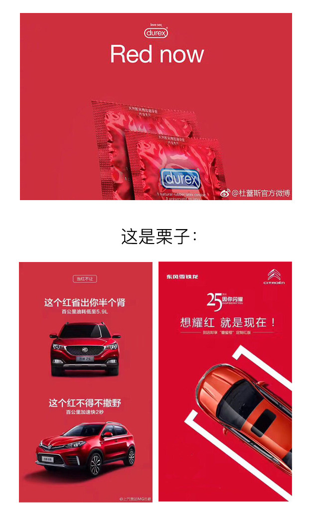 有热点必有杜蕾斯,它是套套界最会做营销的品牌。近期苹果手机发布红色版本后,杜蕾斯第一个跟进,一句“Red Now”引爆朋友圈。汽车行业自然也按捺不住,百花齐放那个热闹啊。