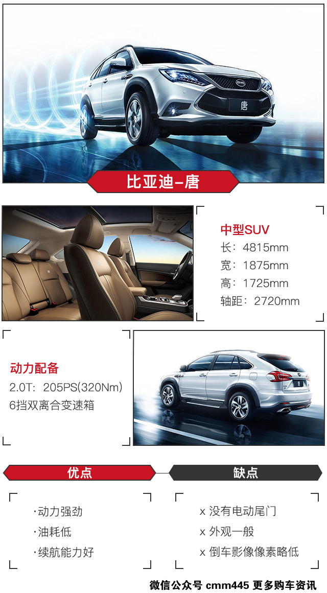 一款SUV它是混合动力车型,0-100km/h加速在5秒之内、四驱并且百公里油耗在2L以内,这样一说是不是有点被吸引到了?对,比亚迪-唐就是这样的一款车。而且虽然它外观颜值一般,但它内饰的用料上乘,还拥有360度全景影像,行车记录仪,PM2.5过滤系统、移动充电站。这些配置都非常对国人的口。