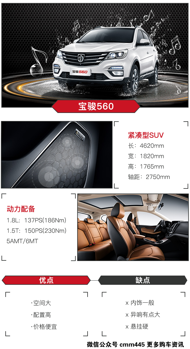作为宝骏品牌的首款SUV车型,宝骏560在产品配置方面拿出了足够的诚意。虽然它外表看起来方头方脑的,但是它是为了提供更大的空间啊;虽然它的配置不够逼格,但是它的配置都实用性非常高啊;虽然它的动力方面没做得那么让人满意,但它的售价极其吸引啊。