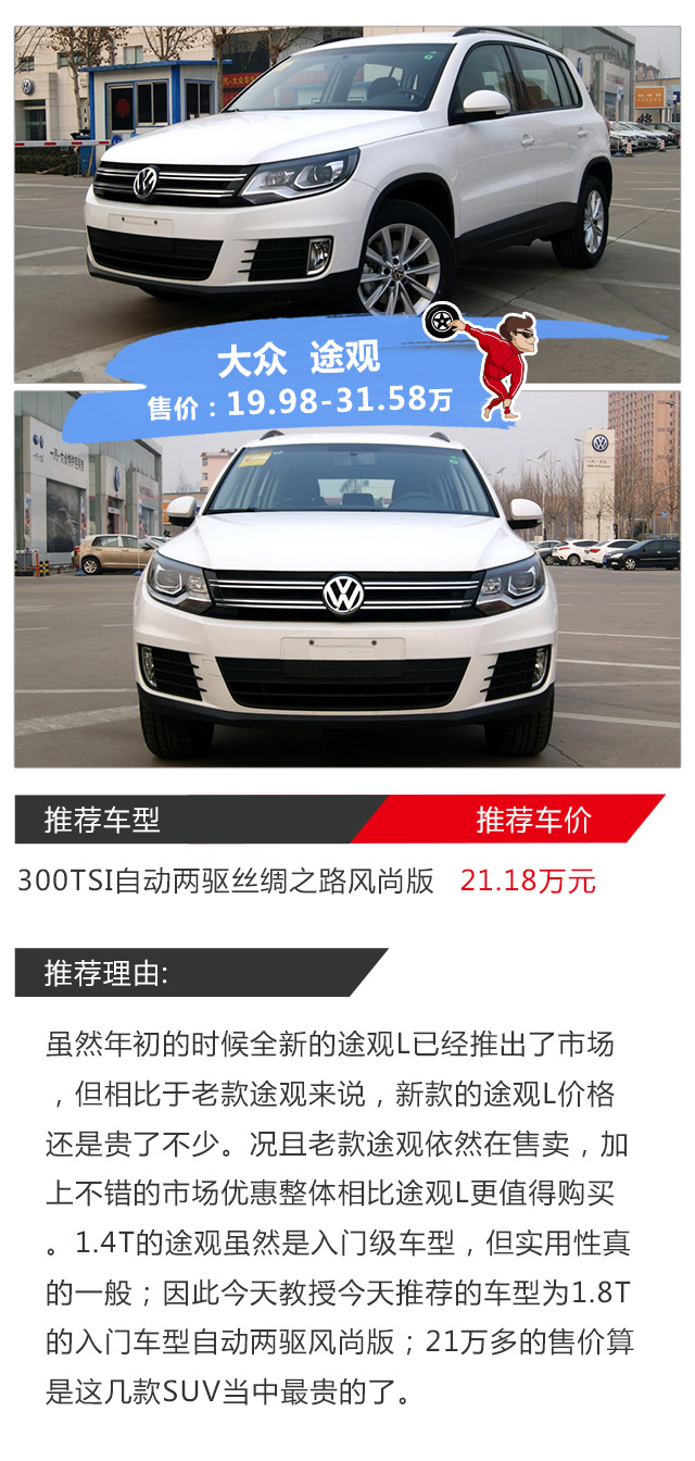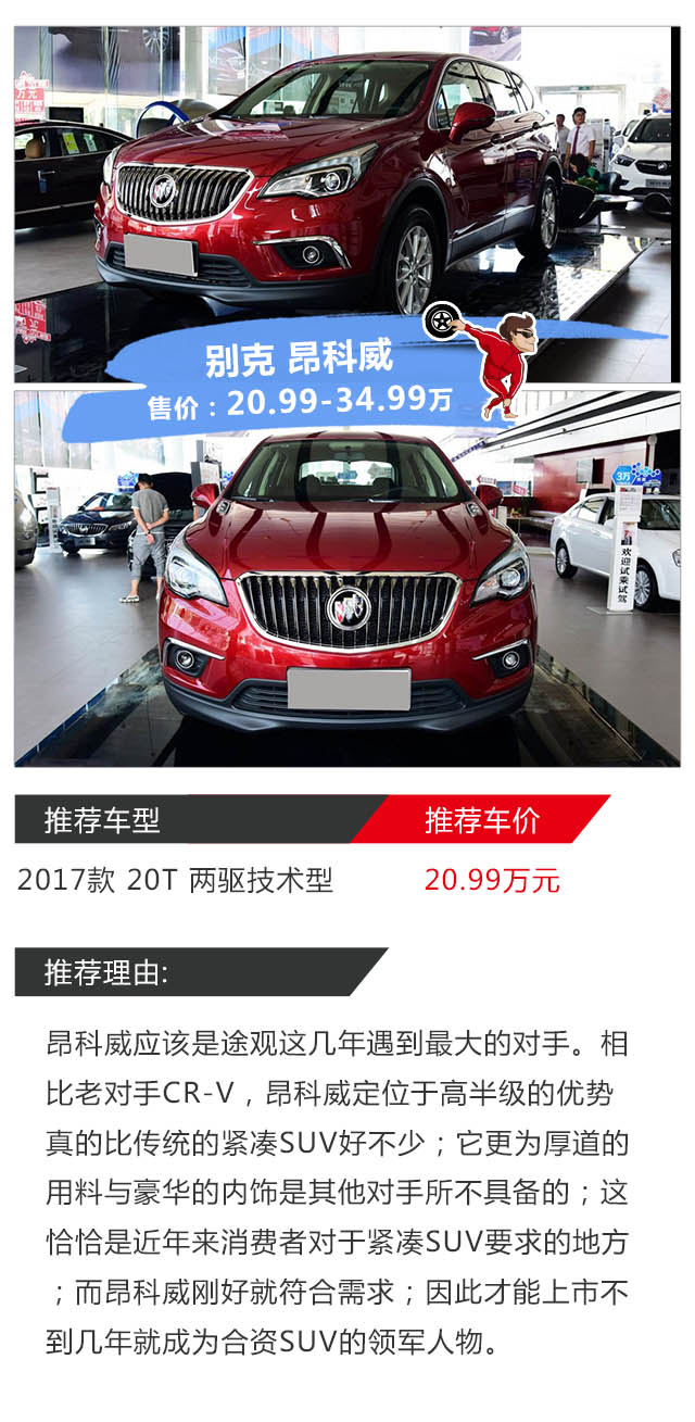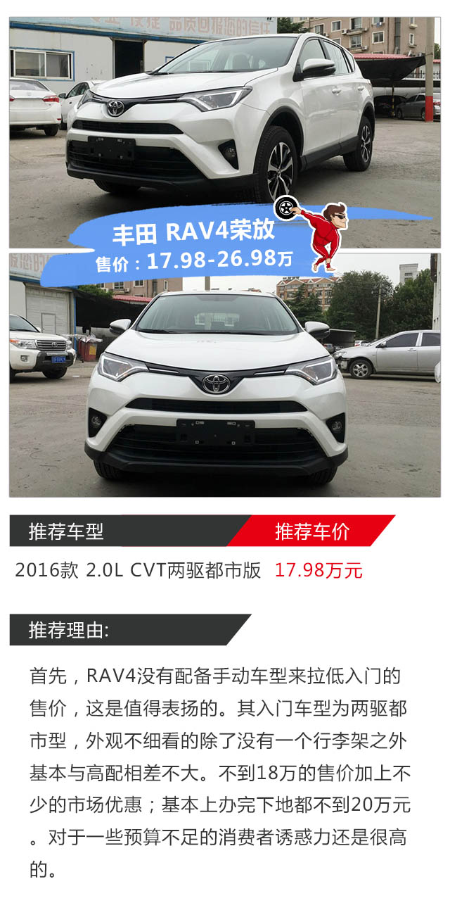 总结:相比于合资小型SUV来说,入门的车型更多的是用来拉低售价的;基本上没多少消费者会考虑。但紧凑SUV就不太一样了,到了近20万的价格配置还比较寒酸就有些说不过去了。对于很多考虑紧凑SUV的消费者来说,首选仍然是入门的车型;只有在配置不足的前提下才会考虑价格更高的车型。今天教授介绍的这几款车型,要把入门车型跑量的是昂科威与奇骏两款车型;它们的配置基本上能满足日常大多数的需求了。而途观与RAV4的入门车型性价比还是稍微差了一些;有需求的话还是选择更高的车型。