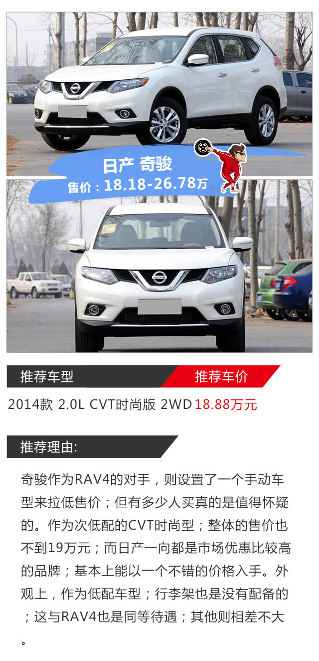 虽然仅是次低配车型,但CVT风尚型整体的配置还是挺丰富的。虽然整体的售价比RAV4两驱时尚型高了近1万块,但多了的配置确是非常实用。虽然没有天窗与胎压监测,但配备了无钥匙进入与一键启动、同时还有LED日间行车灯与后排出风口;无论是外观还是后排乘客的乘坐都有考虑,看来虽说是低配车型;但相比RAV4,日产很明显是靠它走量的。