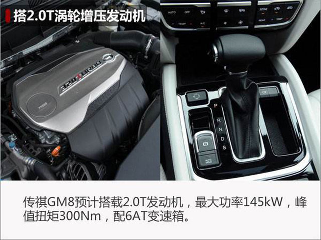 动力总成方面,GM8将搭载广汽自主研发的2.0T多点电喷发动机,GA8、GS8等旗舰车型同样采用该款引擎。预计最大功率145kW,峰值扭矩300N·m,传动方面将由爱信6AT变速箱完成。
