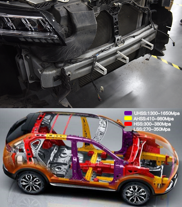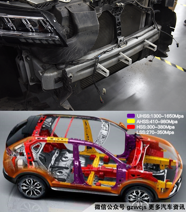 先来拆前保险杠,拆了之后我们看到了前防撞梁,它和一号横梁、AB柱一样都采用了热成型钢,强度高达1500MPa以上,而整车高强度钢以上的材料占比高达79%。