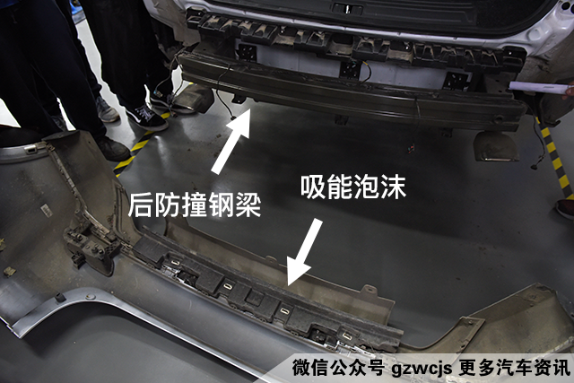 而后保险杠设置了二级吸能,第一级是吸能泡沫块(和后保险杠贴合),之后是钢梁和第二级的吸能盒,能起到保护尾门的作用。