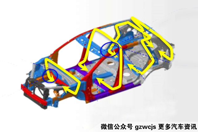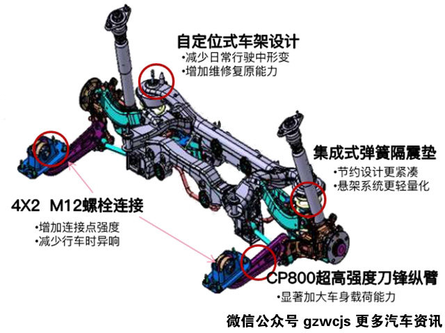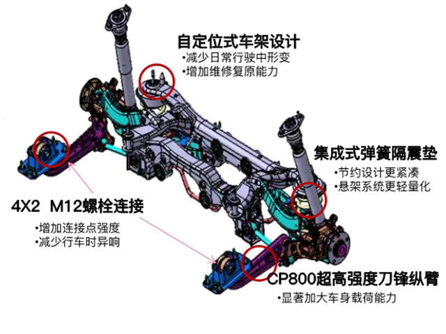 它的后悬挂形似刀锋,因此也被称为刀锋悬挂,其刀锋纵臂能增加载荷能力。控制杆与副车架通过8+M12螺栓连接,增加连接点强度,减少行车时的异响。同时,上摆臂采用U型冲压一体式结构,相对普通轿车拼接而成的结构,提供了更好的刚度。副车架通过两个横梁组合来提升刚度,同时副车架与弹簧盘采用一体式结构,有利于提升车辆的稳定性。