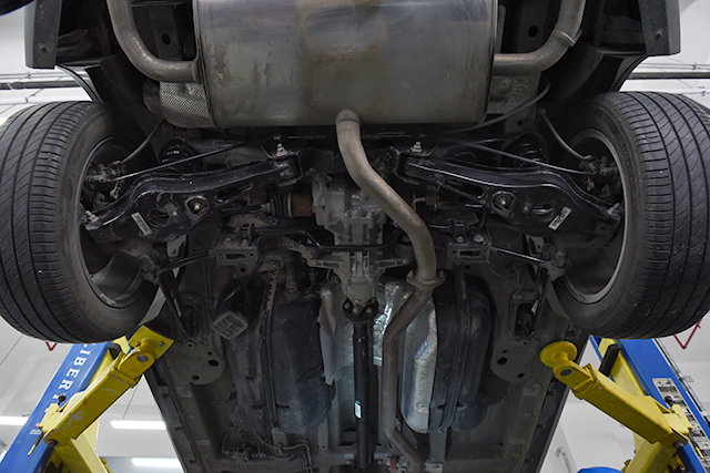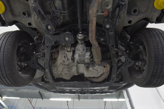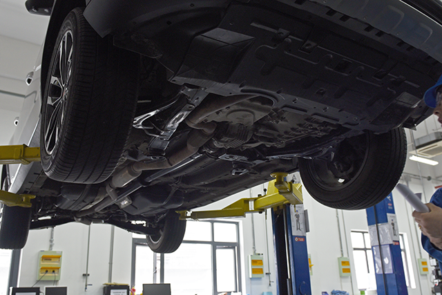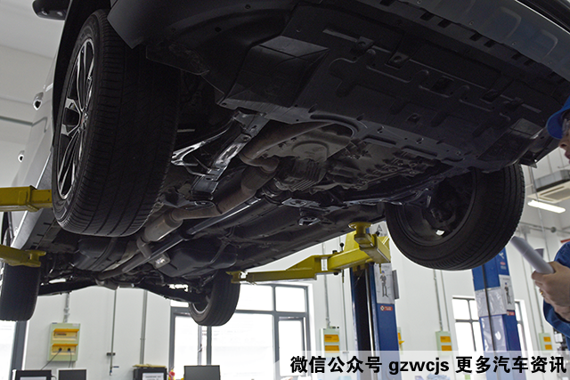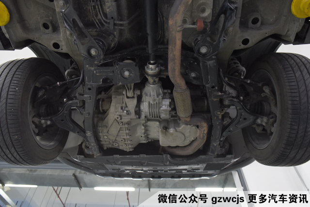 拆完前后杠后车被抬起来了,我们看到了它的底盘。