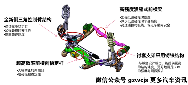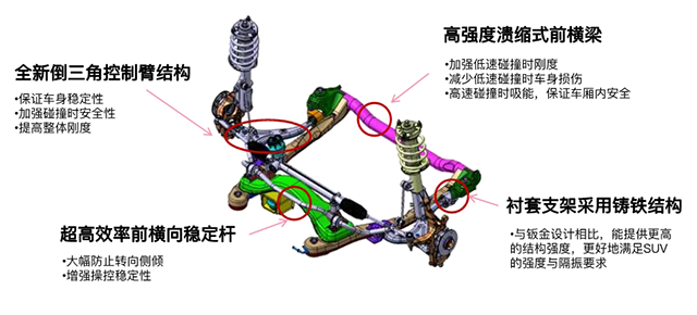 前悬挂方面,倒三角控制臂、高效横向稳定杆、铸铁衬套支架等,都能增加车辆的稳定性,并且摆臂采用了越野SUV才会用的倒扣防脱式下摆臂球头,球销直径35mm,比普通轿车大近30%。减振器缸筒达到55mm(比普通轿车大15-20%),是专门为城市SUV开发的,配合C型侧向力补偿弹簧,过弯时候支撑更足且减震效果更佳。