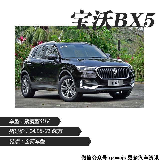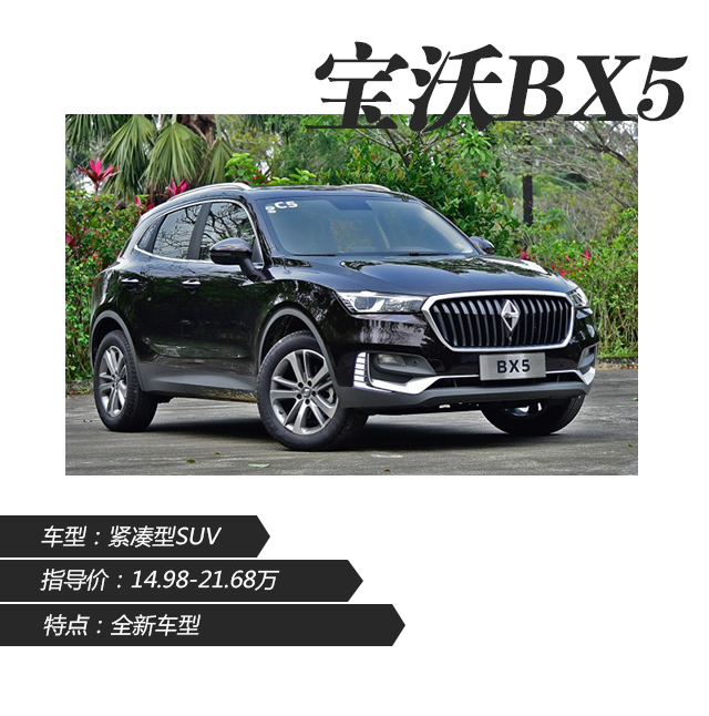宝沃BX5于2016年广州车展首次在国内亮相,车头处沿用了宝沃BX7大气稳重的家族化前脸设计,整体风格又偏向时尚年轻路线。大面积直瀑式镀铬进气格栅很有档次感,细节处的亚光银色处理也是设计上的加分项。宝沃BX5在配置方面亮点不少,刹车辅助、车身稳定控制系统、上坡辅助、自动驻车等安全配置均为全系标配,全景天窗、后座出风口、自动空调、温度分区控制、全景影像、后视镜电动调节、定速巡航等功能也覆盖到了绝大多数车型。