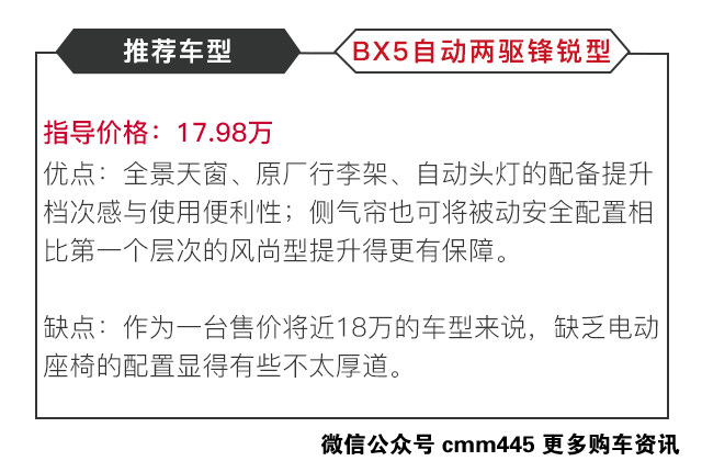 最后,给各位一个购买建议,宝沃BX5的推荐车型是自动两驱锋锐型,作为城市一款以城市通勤为主要用途的紧凑型SUV来说,四驱显得没有太多必要,而17.98万的锋锐型相较于16.98万的风尚型来说,一万块的差价可换来的是前后的侧气帘、全景天窗、自动头灯(氙气)等配置,便利性和档次感更优。