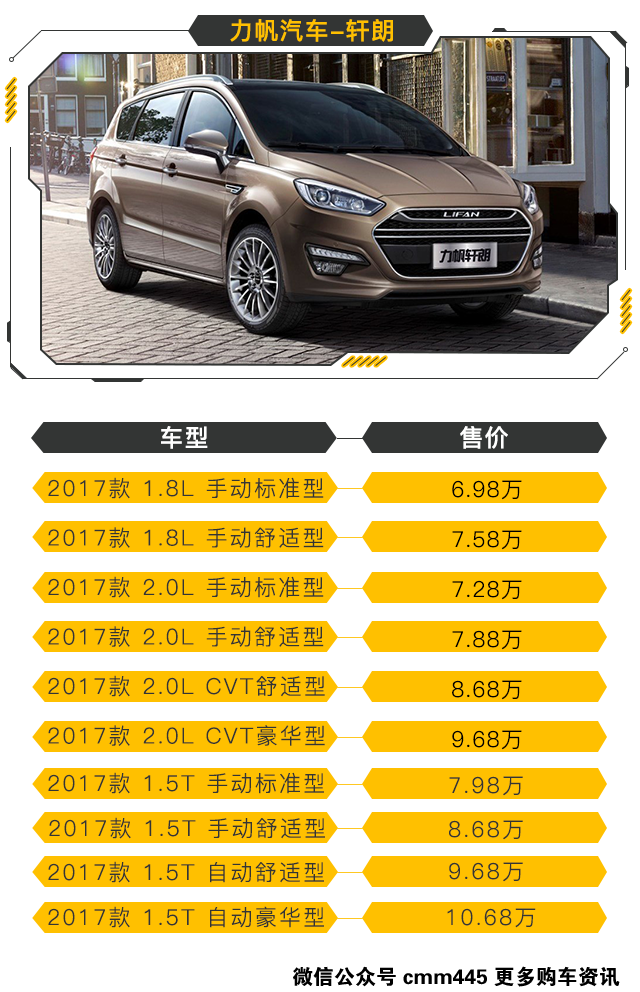 不过现在这个局面即将被打破,因为又一位强有力的对手来啦,它就是力帆家的轩朗。就在今天28号,轩朗正式上市,价格区间为6.98-10.68万元,先期共推出10款车型。