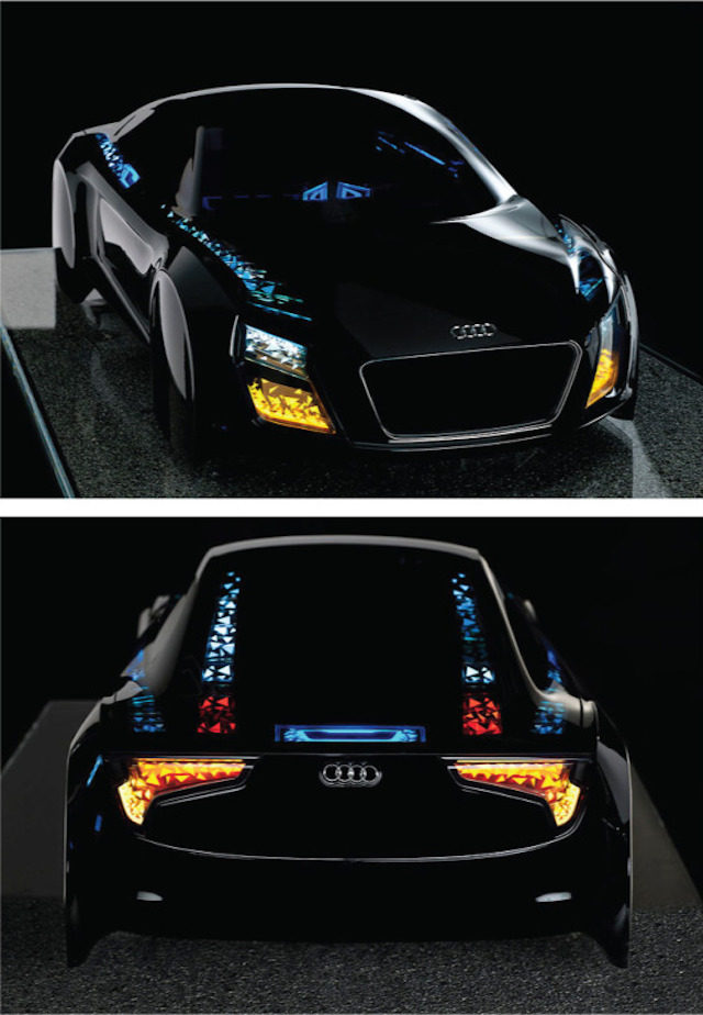在众多厂商研究灯光的时候,丧心病狂的奥迪已经开始考虑把OLED技术运用到车身上了。2013年的CES展上,奥迪发布了OLED技术。与基于半导体晶体构成的点光源LED不同,OLED是平面光源。它发出的光更均匀,调光过程持续可变,能够呈现出独特的动画和3D效果。