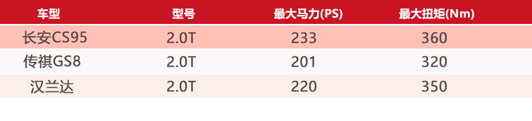 CS95用的蓝鲸2.0TGDI直喷增压发动机,据长安介绍是目前首款自主研发的2.0T发动机,核心技术获多项专利,最大马力233PS(171KW),最大扭矩360Nm,在1500rpm即可爆发最大扭矩的85%达到300Nm,在2000rpm左右可启发发动机超增压功能,瞬态可爆发最大380Nm的扭矩,这样能确保如此大的一台车的中低速段的行驶感受。这个账面数据完胜GS8,同时也达到了全球主流产品的水平,难怪发布会上领导们都自信满满的。配合爱信6AT变速箱和博格华纳的四驱系统,根据媒体们的介绍,整车驾乘质感比以往的国产车要有提升。