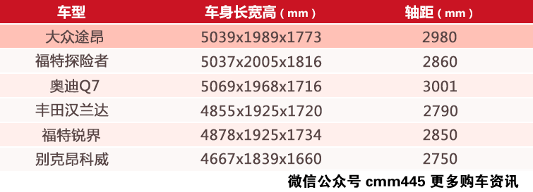 国人购车“以大为尊”的想法可谓是根深蒂固,特别是SUV车型,途昂这厮给人的第一感觉就是:“真TM大.....”赶上Q7的尺寸再加上宽体高大的设计手法,更让途昂看上去彰显威武霸气的一面。或许在孔武有力的途昂面前,锐界都可以用大家闺秀来形容,而更显秀气的汉兰达......小家碧玉吧。