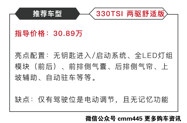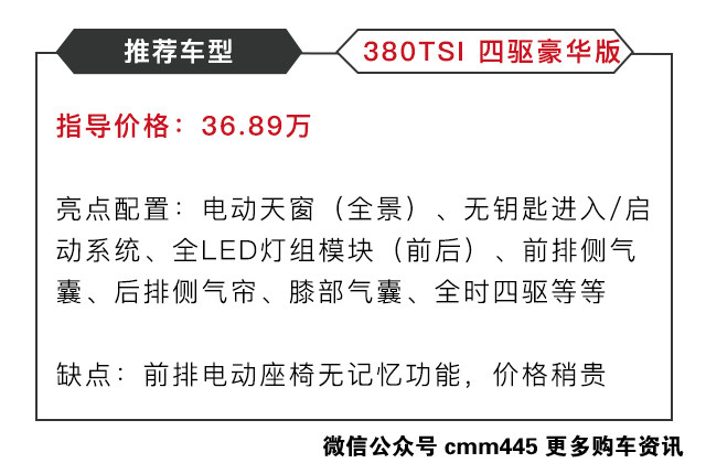 但话说回来,这么一台中大型SUV,对于普罗大众来说一般是家里的第二台甚至是第三台车的备选产品,更多的人希望它有更强大的功能性,如此,定价36.89万的380TSI四驱豪华版是最为合适的选择。