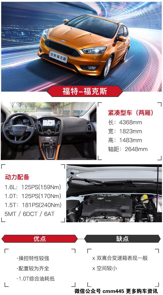 新款福克斯小虎最推荐的是中配车型1.6L 手动风尚型智行版以及1.0T 自动超能风尚型智能版,1.6L之所以不推荐自动挡车型主要是由于匹配的是双离合变速箱,换挡逻辑有些奇葩;而1.0T则匹配6AT变速箱,表现会好很多而且还省油。中配车型在安全配置上已经不缺,且天窗、倒车雷达、自动空调等配置也能提升驾驶便利性以及舒适感。