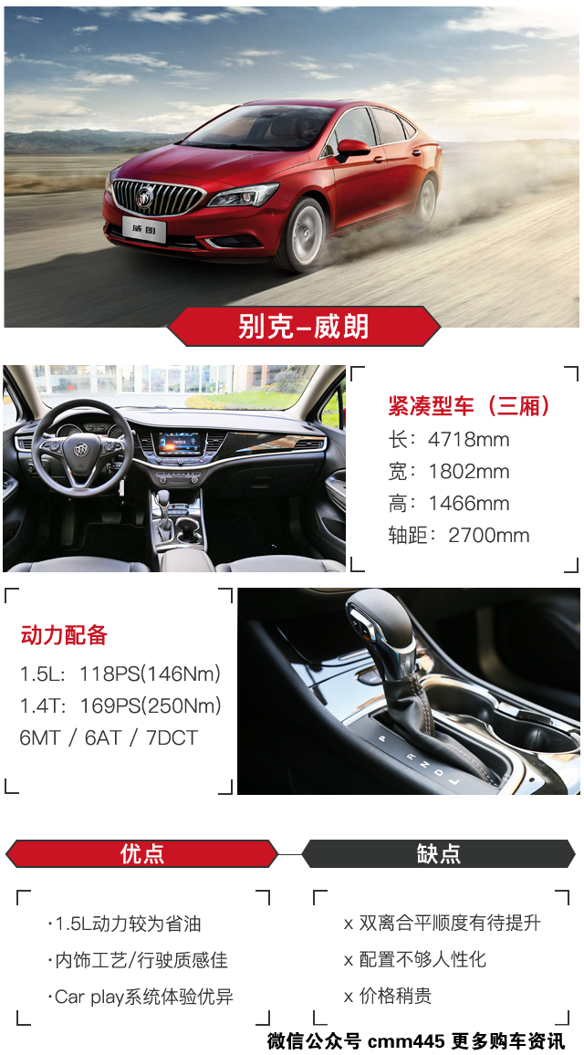 威朗的配置起步级也比较高,因此小虎觉得次配级领先型就完全够用了,相比入门级进取型多出了前排座椅电动调节、前排座椅加热、真皮座椅以及更高级的多媒体系统等,各方面提升都还不错。而动力方面个人更推荐1.5L+6AT版本,虽然不太强劲但稳定性以及平顺度都足够出色。如果追求动力输出,20T 双离合精英型也是不错的,只是价格会贵一些。