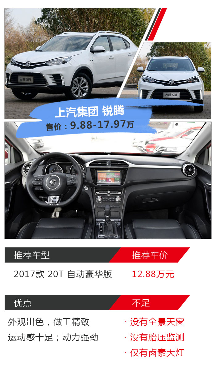 就锐腾最新推出的车型,教授最为推荐其20T自动豪华版,无论是配置与价格都比较适中。作为1.5T次顶配车型,它拥有上坡辅助、自动驻车与陡坡缓降,比顶配车型主要少了一键启动、无钥匙进入与定速巡航等配置,在使用上便利性差了一点,但不会影响日常使用,假如你预算足够的话可以花多1万块上顶配。
