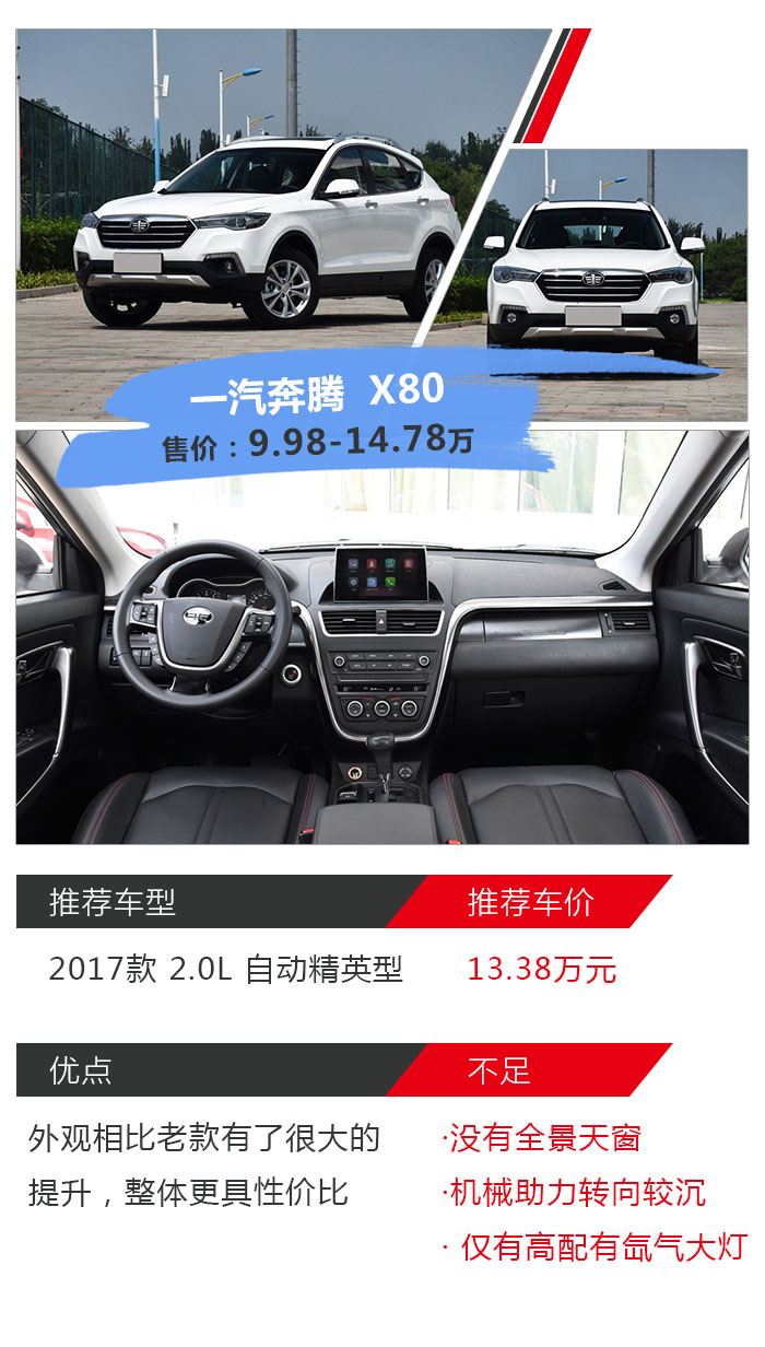新款X80搭载了2.0L与1.8T的发动机,数据上1.8T会有明显优势;但教授认为2.0L足以满足日常代步。究其所推出的车型,教授推荐其2.0L的顶配车型。虽然没有一键启动与无钥匙进入,但为其配置的自动驻车、上坡辅助与胎压监测对于日常驾驶帮助提升很大。