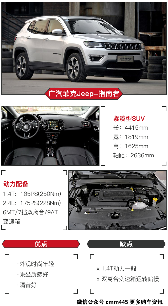 可以看出Jeep有意将指南者打造成一款走量的车型,但是在城市型SUV的造诣上Jeep还是欠缺一点火候。指南者在一些做工上依旧有待改进,而变速箱虽然经过优化,但与大众系相比依旧有差距。因此,指南者更适合那些对Jeep有信仰的人购买。