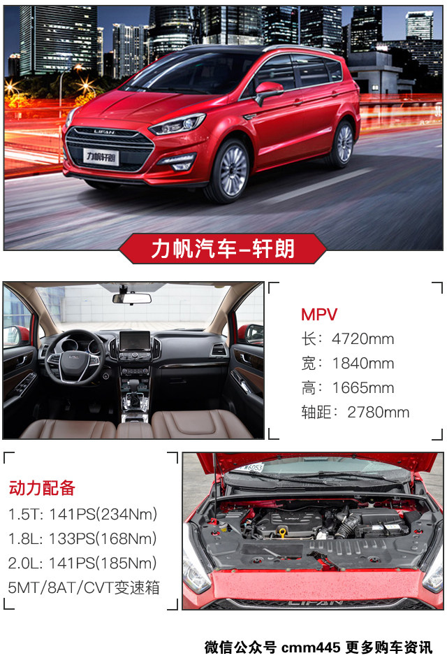 虽然同级别的很多MPV都没有自动挡车型,或者只有一个所谓的智能手动挡,但是这里面就不包括力帆轩朗。因为力帆轩朗共有五个动力组合可选,分别是1.8L+5MT、2.0L+5MT和CVT、1.5T+5MT和8AT。