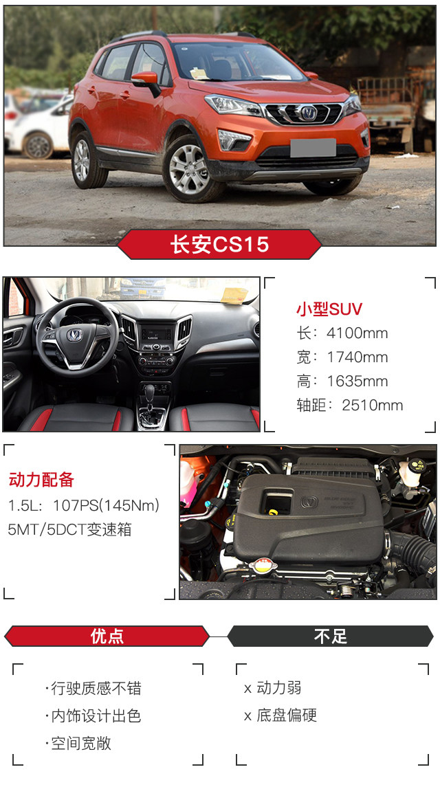 几万块想要SUV?小虎毫无疑问会推荐这款CS15,作为一款5-7万的小型SUV来说,对车辆的质感本不应该有太多要求,但是CS15却丝毫没有粗糙感,这是它难能可贵的地方。隔音和用料表现也很不错,虽然车子动力十分弱,但是好在离合结合点很宽泛,手动变速箱的换挡手感也不错,属于很好开的类型的车子,自动车型并不是很推荐~双离合你懂的。