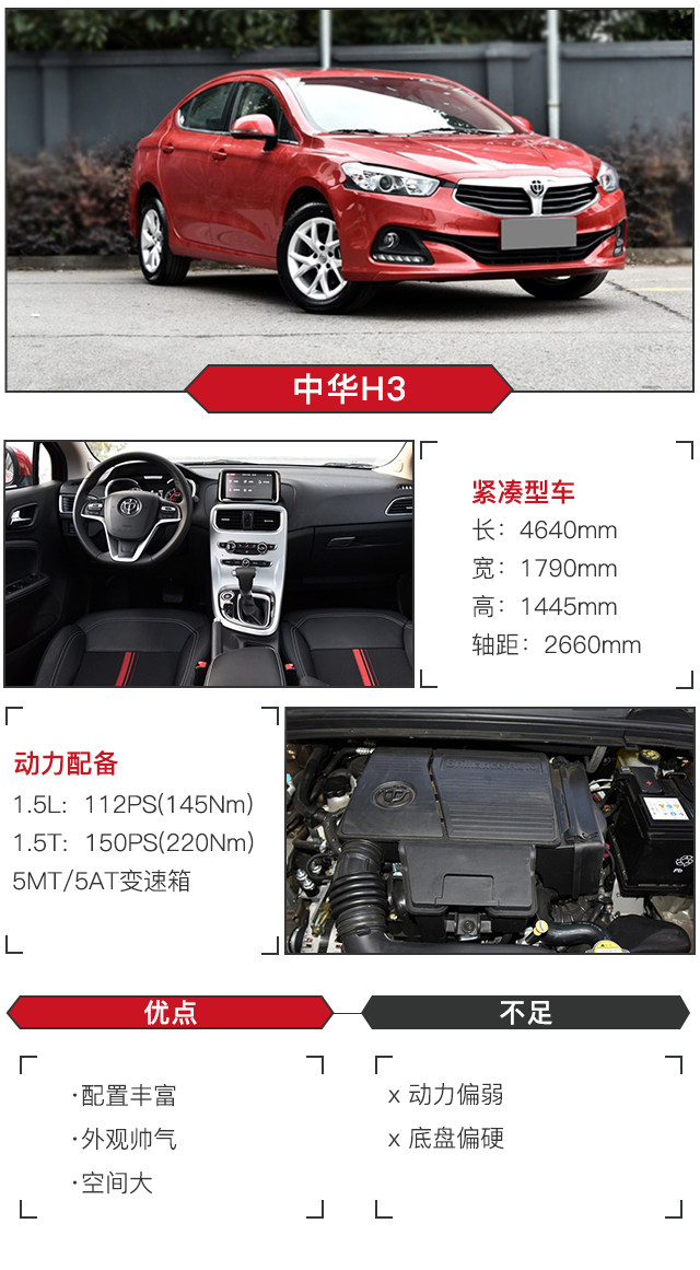 6-8万想要一台帅气的轿车?没问题,看看这台中华H3吧,H3的外观设计是它最有特色的地方,舒展的尾部设计、较长的轴距和可靠的变速箱都是优点。H3在这个价位车型里性价比还是不错的,大空间也符合人们的家用需求,只不过较硬的悬挂和较弱的动力是需要妥协的地方(话说回来,7万左右的车又有哪个动力很强呢?)