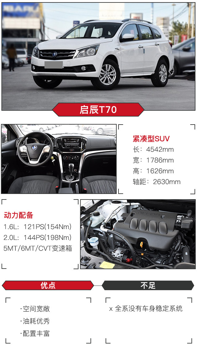 启辰T70来自日产平台,并且发动机和变速箱也都是日产的,因此可以理解为一台加长加大的老款逍客,但是它比逍客更加便宜而且配置高;T70最大的特点在于空间大省油省心(毕竟十多万的自主SUV省油的真的不多,买合资又只能买个小型SUV),毕竟基本上就是一台日产嘛,作为平时城市使用的车辆还是很不错的,在碰撞测试中T70也达到了5星安全级别,只是全系没有车身稳定系统让人觉得遗憾。