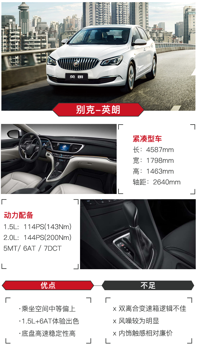 老张在路上(2017款 15N 自动精英型):很喜欢君越但是钱不够,只能买个“小君越”英朗。最满意的当然是外观,虽然没有威朗那么激进,但秒杀路上同级别车型却一点不难。然后动力方面我买的是1.5L的,感觉对这个小车身来说动力是有富余的,并没有想象中那么肉。而且油耗比较低,平时保养也花不了多少钱。不足的地方就是有些设计让我很头疼,比如多功能方向盘按键设置在右边,但我个人就喜欢用左手操作!还有中控的多媒体屏幕也是很不好用,我打算换个大屏的。