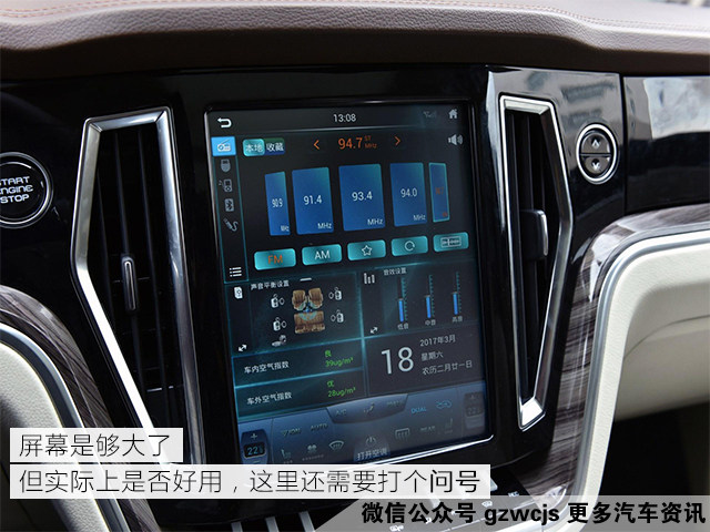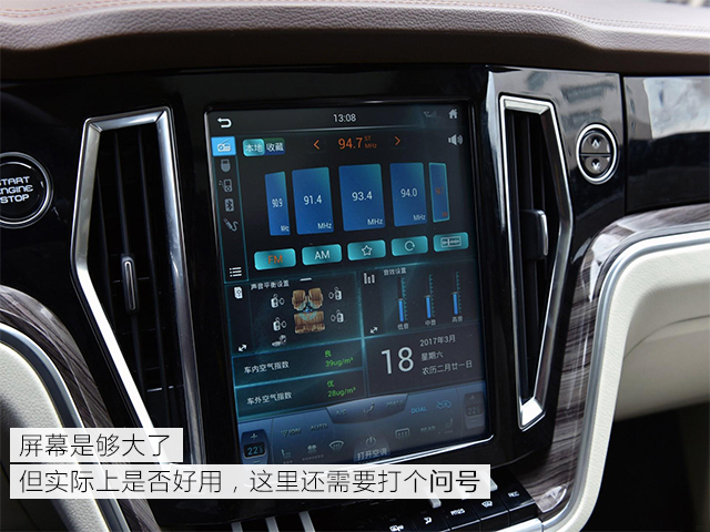 细节方面的配置则有不少亮点,首先是12寸的大屏幕,集成了多媒体功能、车辆设置、空调设置等功能。但教授比较担心的是这块屏幕的触控响应会不会不够灵敏,而且从观感上能够看到这块屏幕的界面效果是比较廉价的,分辨率也不高,所以这块大屏好不好用,还不好说。