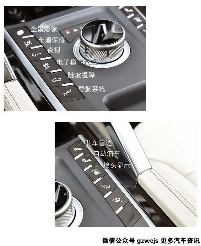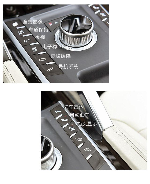 旋钮式挡把的两边是两列的车辆功能按键,从按键的图案上来看,众泰T700将配备全景影像、车道保持、夜视、电子稳定系统、陡坡缓降、自动泊车、HUD抬头显示等功能,SUV上比较实用的功能都有配备,这一点倒做得不错。