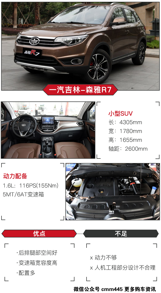 小虎点评:不知不觉,森雅R7在2月份的销量来到了小型SUV的第四位。销量这么好,还得从配置先说起来,2017款车型除最低配以外,均有真皮多功能方向盘、定速巡航等配置。去到8.89万的自动智能型,配置就相当丰富了,有无钥匙进入与启动、后驻车雷达+倒车影像和自动空调等。
