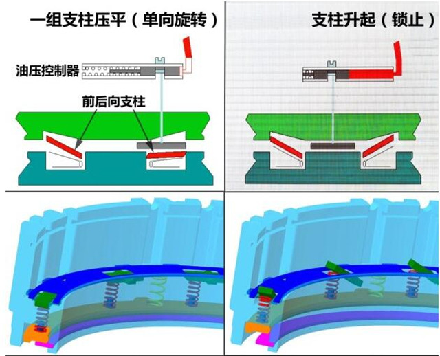 同样是为了控制体积,ZF是用爪型离合器代替传统的离合,爪型离合器占的空间确实是更小,但带来的问题就是标定不好,结合时容易产生顿挫感。而通用的9AT相比自家的6AT需要多一套行星齿轮和两个离合器,其中采用了一套可选择式单向离合器实现两个离合器的功能,从而弥补多一套行星齿轮占用的空间。单向离合器其实不算是一个新技术,关键是用的到位确实能节约空间,其原理大致就是通过液压推动挡板压紧离合就能实现单项转动,取消液压后挡板被弹簧顶回原位就实现了锁止功能,从而可以兼顾一挡和倒挡。理论上这样的结构是可以平顺的实现换挡,不用像爪型离合一样需要转速相当同步才能平顺结合。当然关键还得看标定,同样是ZF9AT,在本田的调校下,冠道的动力表现就没啥毛病,因此作为首款搭载通用9AT的车型,雪佛兰探界者的表现也因此更令人期待。