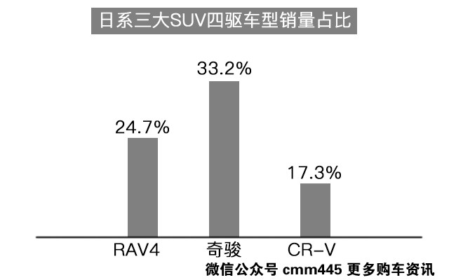 而奇骏2.5L四驱车型销量在全车系中的销量占比达到了33.2%(RAV4四驱车型为24.7%,CR-V四驱车型仅为17.3%),可以看得出选择2.5L奇骏的人也更多是奔着四驱去的,而同价位的昂科威、冠道等中型SUV均买不到四驱车型。通过对奇骏2.5车型的采访中也证实了这点。
