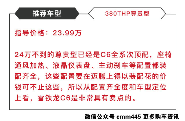 雪铁龙C6就是一款同样在行政商务与家用舒适层面塑造得较好的中型车,内饰皮质用料彰显了法国人做箱包工艺的浪漫与奢华气息,机械调校和乘坐质感比迈腾要来的更加舒适与安逸,而在国人注重的后排空间上,C6的中间地台隆起更低,而且中央扶手的档次感营造得更足。