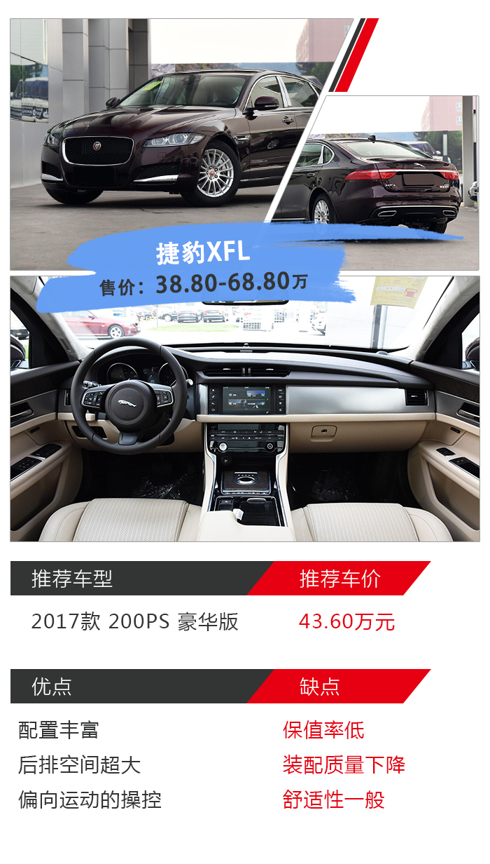 捷豹实现国产化之后带来了一个好处,那就是售价的下降,以前进口的捷豹XF起售价51.8万,现在加长版的国产捷豹XFL起售价38.8万,便宜了一大截,还多出了一个极其夸张的后排空间。