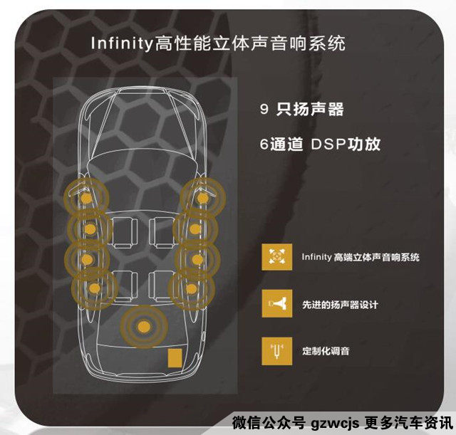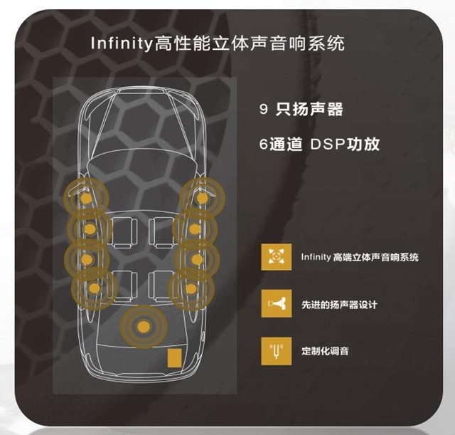宝骏560律动版采用了由哈曼集团旗下的Infinity品牌为宝骏量身定制的HPSS高性能音响系统。这套系统由4高音+4低音+1重低音,共9个音响组成。