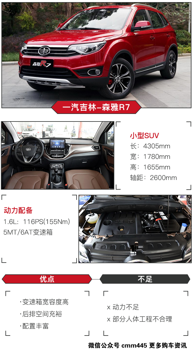 同时,森雅R7的卖点也非常契合国人胃口,那就是大空间和多配置。而动力总成和滤震方面的不足,往往国人并不十分在意。因此,对于这款SUV,只要你看对眼了,还是值得下手的。