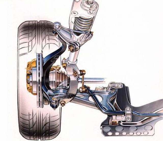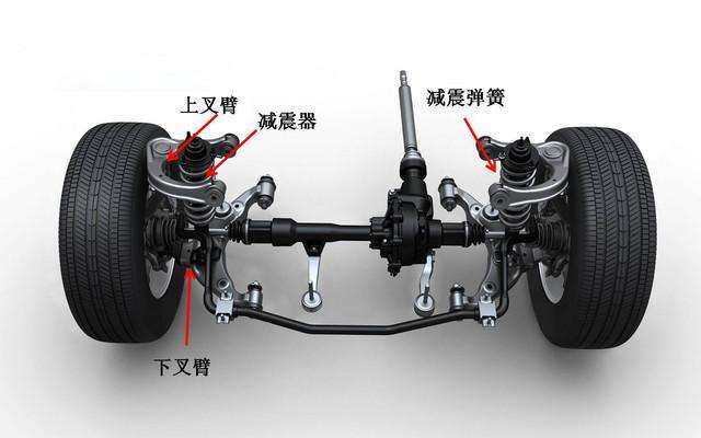 双叉臂式悬架的诞生和麦弗逊式悬架有着紧密的血缘关系,它们的共同点为:下控制臂都由一根V字形或A字形的叉形控制臂构成,液压减震器充当支柱支撑整个车身。不同处则在于双叉臂式悬架多了一根连接支柱减震器的上控制臂,这样一来有效增强了悬架整体的可靠性和稳定性。