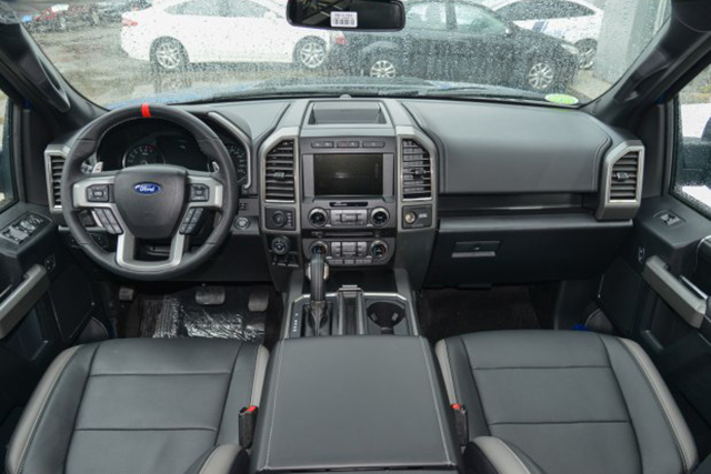 内饰方面,猛禽的设计以直线和直角为主,各功能区域划分清晰,操作便捷且实用。新车配备有多功能真皮方向盘、换挡拨片、双区自动空调、带有8英寸触屏/语音识别等功能的SYNC 3系统、一键启动、陡坡缓降、全景影像、拖拽辅助、四驱模式选择、前排真皮座椅加热/通风、前后排230V三相电源插口等多项配置。