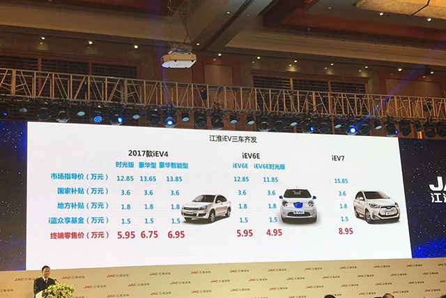 另外在传统燃油车领域布局高端产品、推进品牌向上的同时,江淮新能源车基于十年七代技术迭代研发,iEV6E、iEV7、2017款iEV4三款新车同时上市,巩固江淮在新能源车领域的领先地位。作为江淮首款微型电动车,iEV6E最高时速可达到102km/h,在经济模式下,续航能力最高可达205公里,配合1小时可充80%的快充效率,满足日常所需,另外,该车还搭载了百度Carlife等多种智能互联配置,而且其五星级整车安全达到国际ASIL C级,产品力远超同级。主打智能安全的第七代产品,江淮iEV7采用纯电动车专用底盘、五层电池安全管理设计,并升级了智能配置,将以国民智能纯电动轿车的定位引领环保出行新潮流。