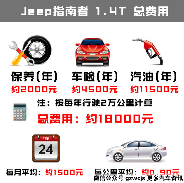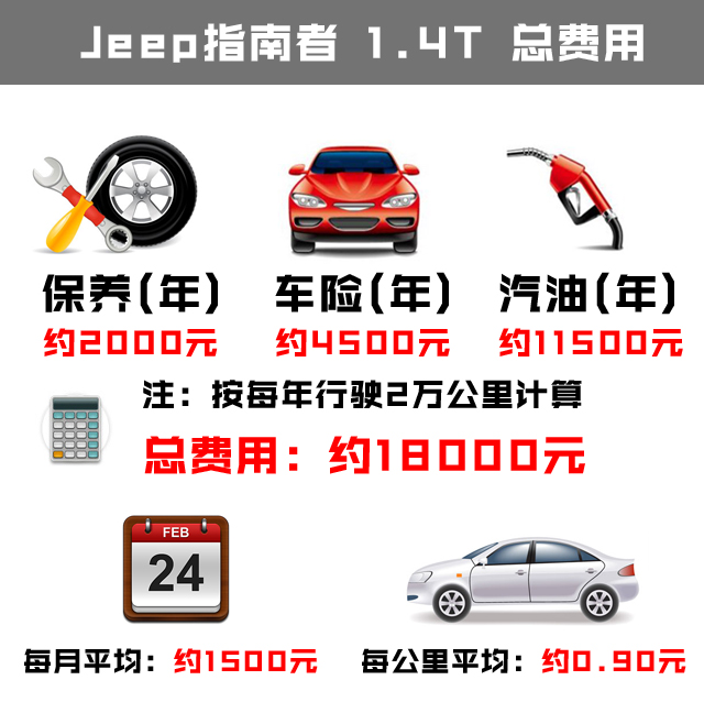Jeep大切诺基,男人的尤物,而国产化的Jeep指南者酷似大切诺基的外观造型,所以得到了不少消费者的关注,售价15.98-24.18万元,提供1.4T和2.4L两种动力选择,2.4L顶配仅仅只有一款车型可选,大部分消费者还是对1.4T车型关注,这次就拿1.4T的车型计算一下J eep指南者的养车成本,看看有没有超出你的心理预期。