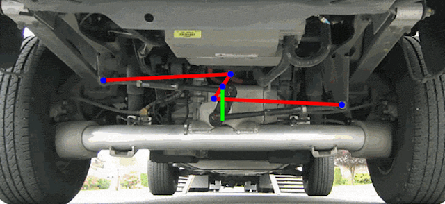 其工作原理是将非独立悬挂的车轮装在一个扭力梁的两端,当一边车轮上下跳动时,会使扭力梁绕俩红线跳动,从而带动另一侧车轮也相应地跳动,减小整个车身的倾斜或摇晃。由于其自身具有一定的扭转刚度,可增加车辆的侧倾刚度,提高车辆的侧倾稳定性。
