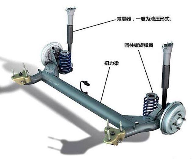 扭力梁式悬挂是汽车后悬挂类型的一种,是通过一个扭力梁来平衡左右车轮的上下跳动,以减小车辆的摇晃,保持车辆的平稳,尽管有些厂商宣称自己的车装备的是扭力梁式半独立悬挂,但是扭力梁还是非独立悬挂的一种。