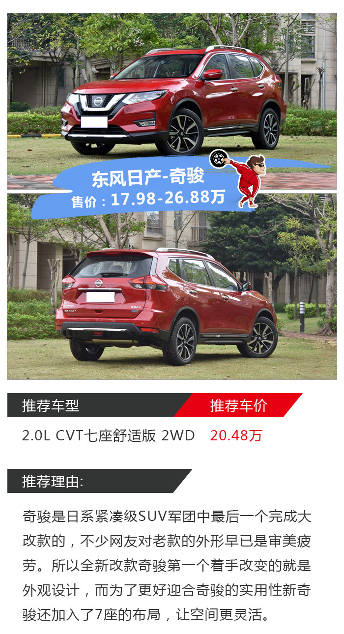 改款的外观不能给到你掏腰包的理由?那新增的7座车型一定能博得你关注。改款奇骏轴距达到了2706mm,车长增加了32mm。虽说相比老款增加不多,但奇骏原本的车身尺寸在紧凑级SUV中早已是越级的存在。